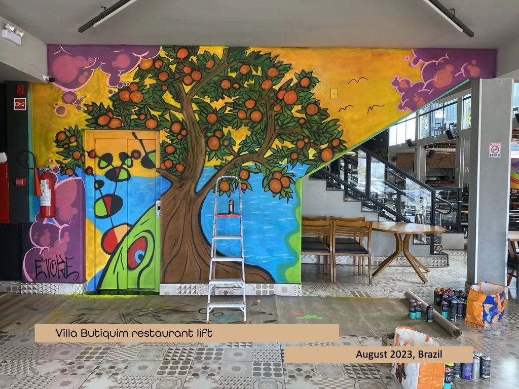 Our work merges graffiti roots with design and composition made to transform restaurants, hostels, offices, gyms, and public areas into vibrant, authentic environments. Each piece is original, tailored to the space, and inspired by the connection between art, people, and place.